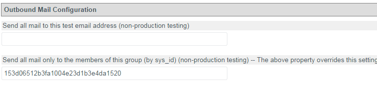 - “glide.email.test.group” – Created in the update set, this contains the sys_id (or name) of the group that will serve as the group of users allowed to receive email.